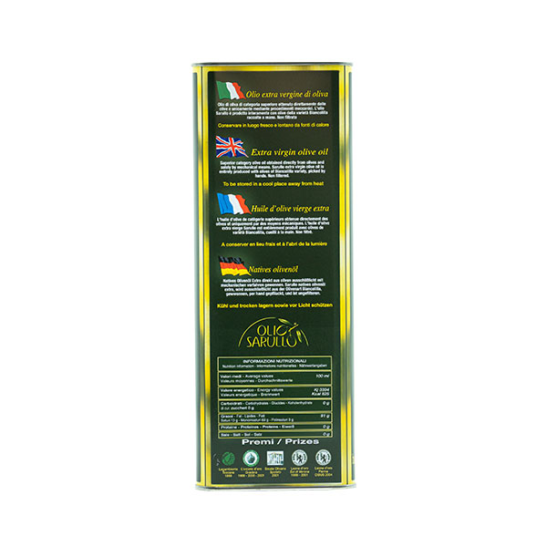 The Extra Virgin Olive Oil Sarullo in the convenient size of the 5-liter tin is a monocultivar oil obtained from olives of the variety Biancolilla.